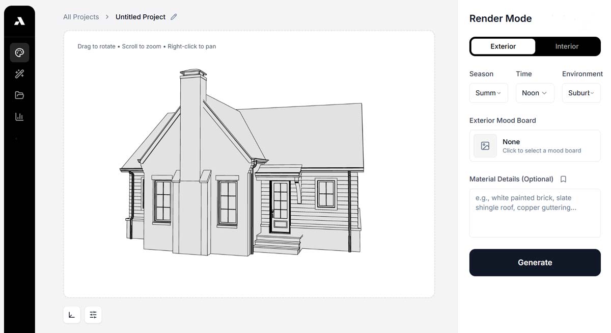 This approach works well for early design stages or fast client visuals. Because the AI render is based on a single image, the camera angle remains fixed, making this method best suited for single-view concepts.